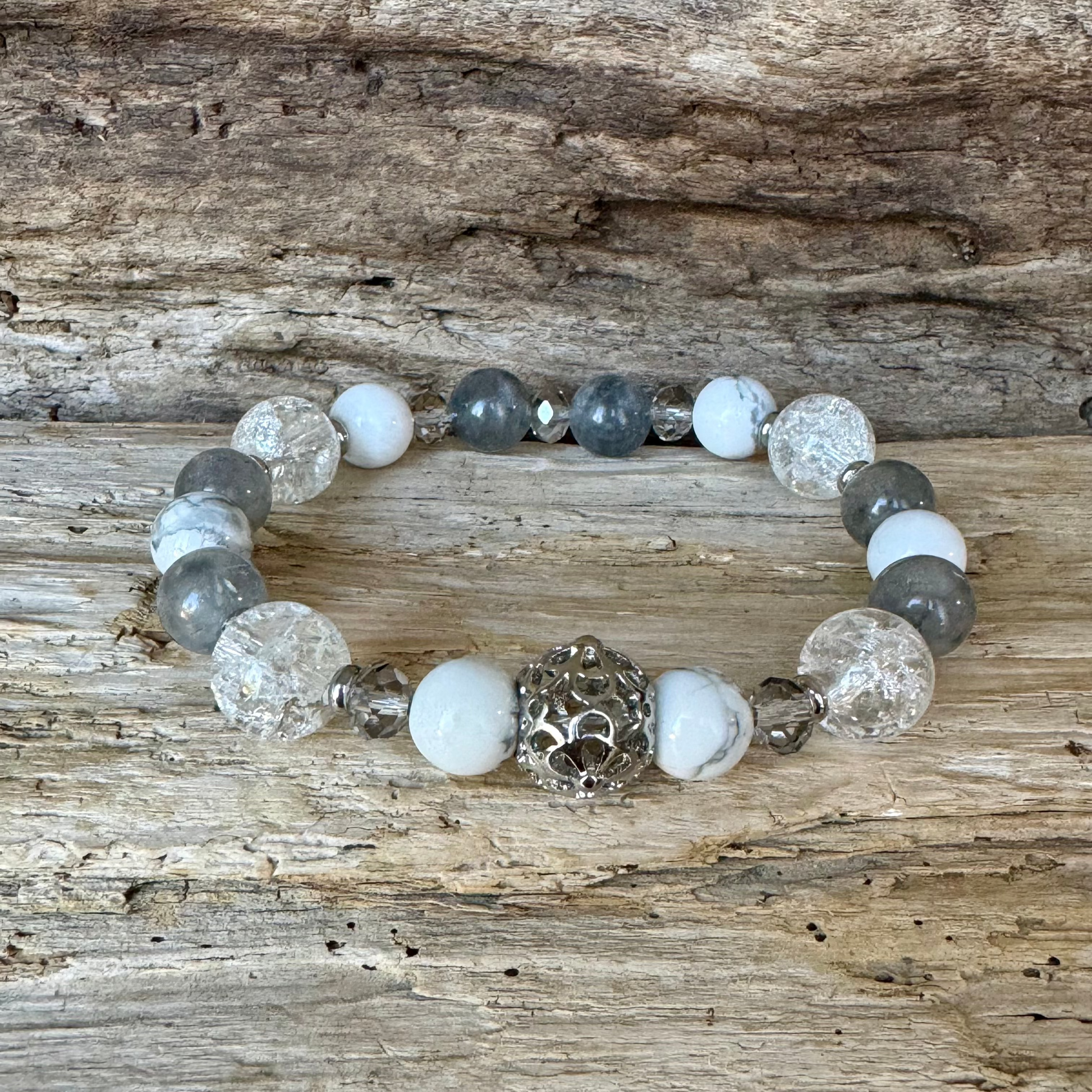 Bracelet en cristal de quartz, quartz nuageux et howlite, une combinaison parfaite pour allier élégance et bien-être. Le cristal de quartz amplifie l'énergie positive, le quartz nuageux apporte clarté et tranquillité, et la howlite apaise les émotions.